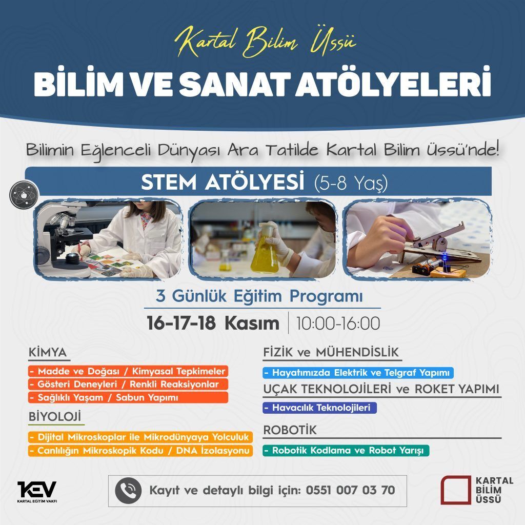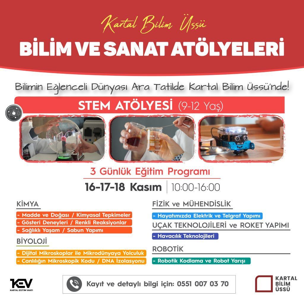 16-17-18 Kasım'da bilimin eğlenceli dünyasında keyifli bir yolculuk yapmak isteyen tüm öğrencileri, eğlenerek öğrenecekleri STEM (Kimya, Biyoloji, Fizik ve Mühendislik, Uçak Teknolojileri ve Roket Yapımı, Robotik) Atölyelerine bekliyoruz!