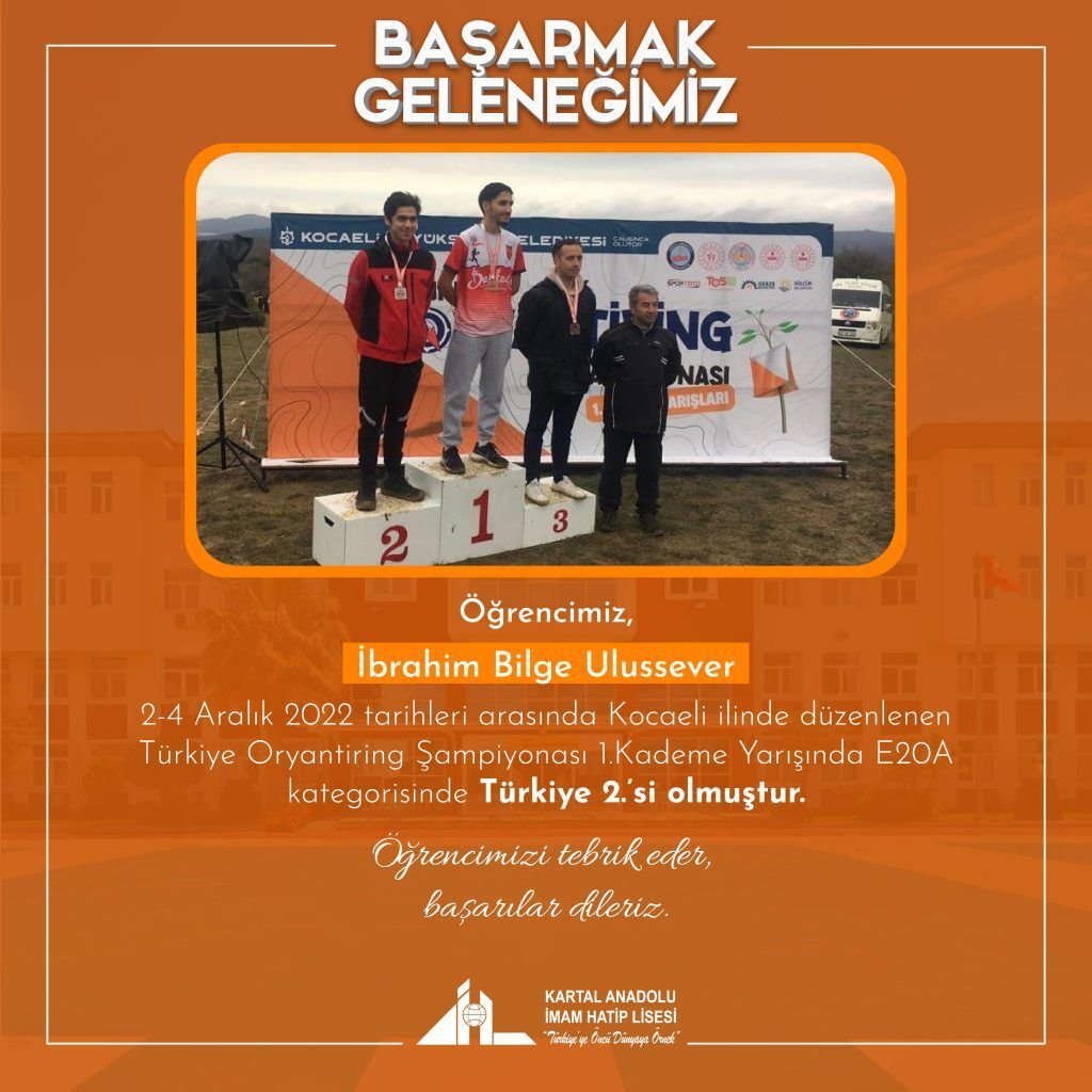 Öğrencimiz, İbrahim Bilge Ulussever 2-4 Aralık 2022 tarihlerinde Kocaeli ilinde düzenlenen Türkiye Oryantiring Şampiyonası 1.Kademe Yarışında E20A kategorisinde Türkiye 2. olmuştur.