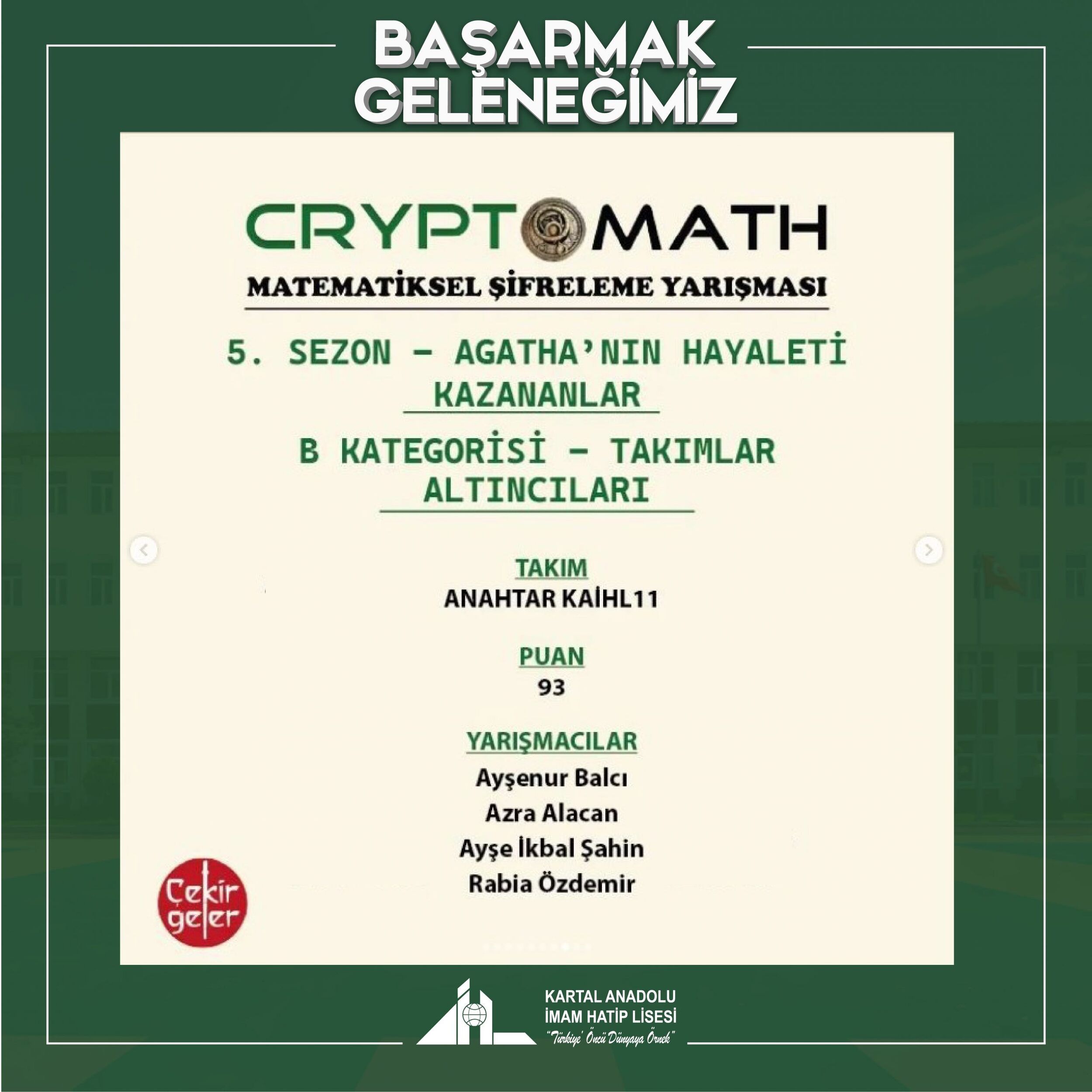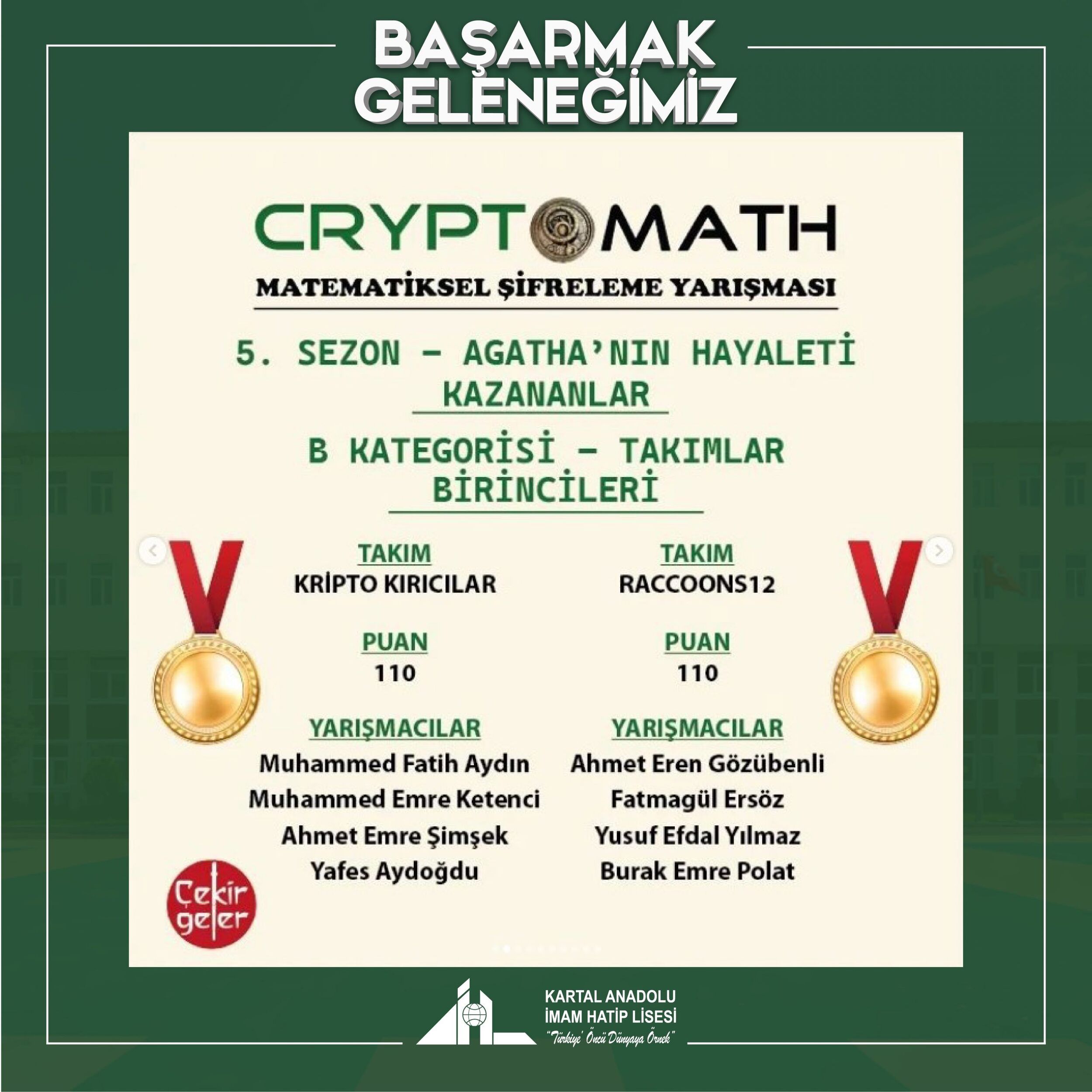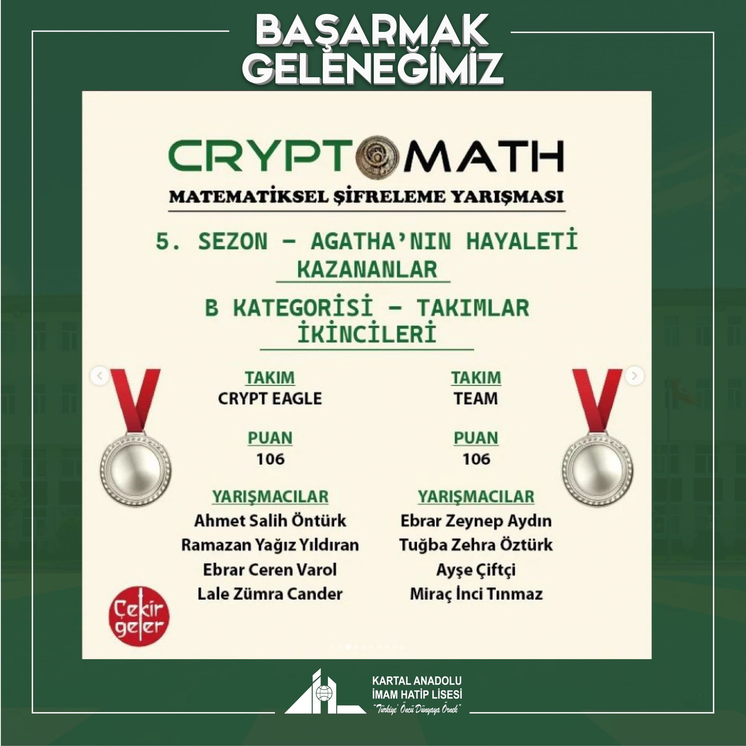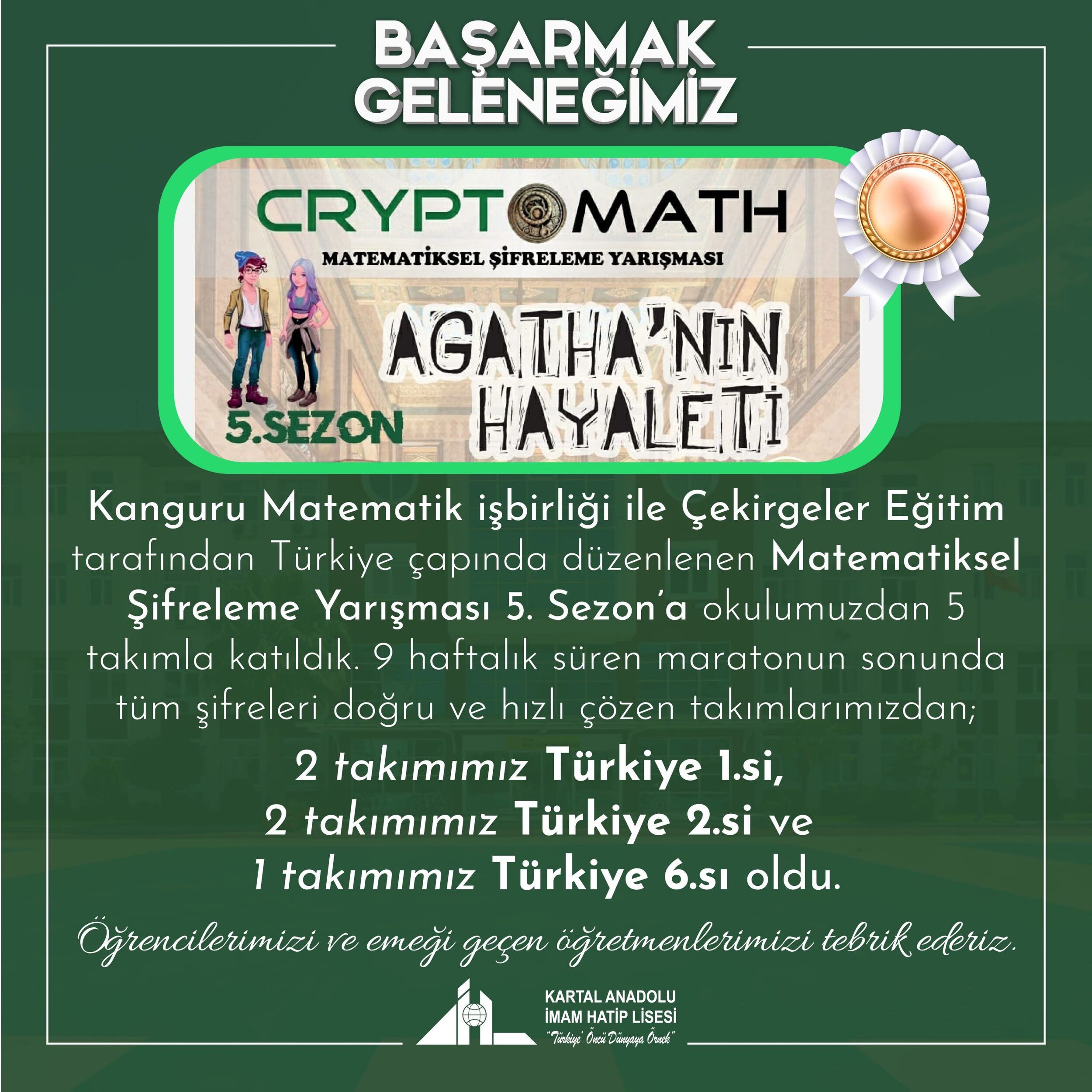 Kanguru Matematik işbirliği ile Çekirgeler Eğitim tarafından Türkiye çapında düzenlenen CryptoMath Matematiksel Şifreleme Yarışması 5. Sezon’a okulumuzdan 5 takımla katıldık. 9 haftalık süren maratonun sonunda tüm şifreleri doğru ve hızlı çözen takımlarımızdan;