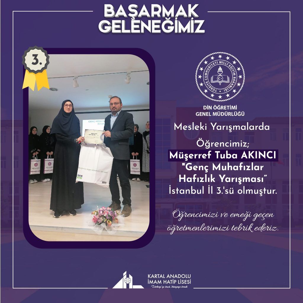 Din Öğretimi Genel Müdürlüğümüz tarafından düzenlenen Mesleki Yarışmalarda öğrencimiz Müşerref Tuba AKINCI "Genç Muhafızlar Hafızlık Yarışması" İstanbul İl 3.'sü olmuştur.