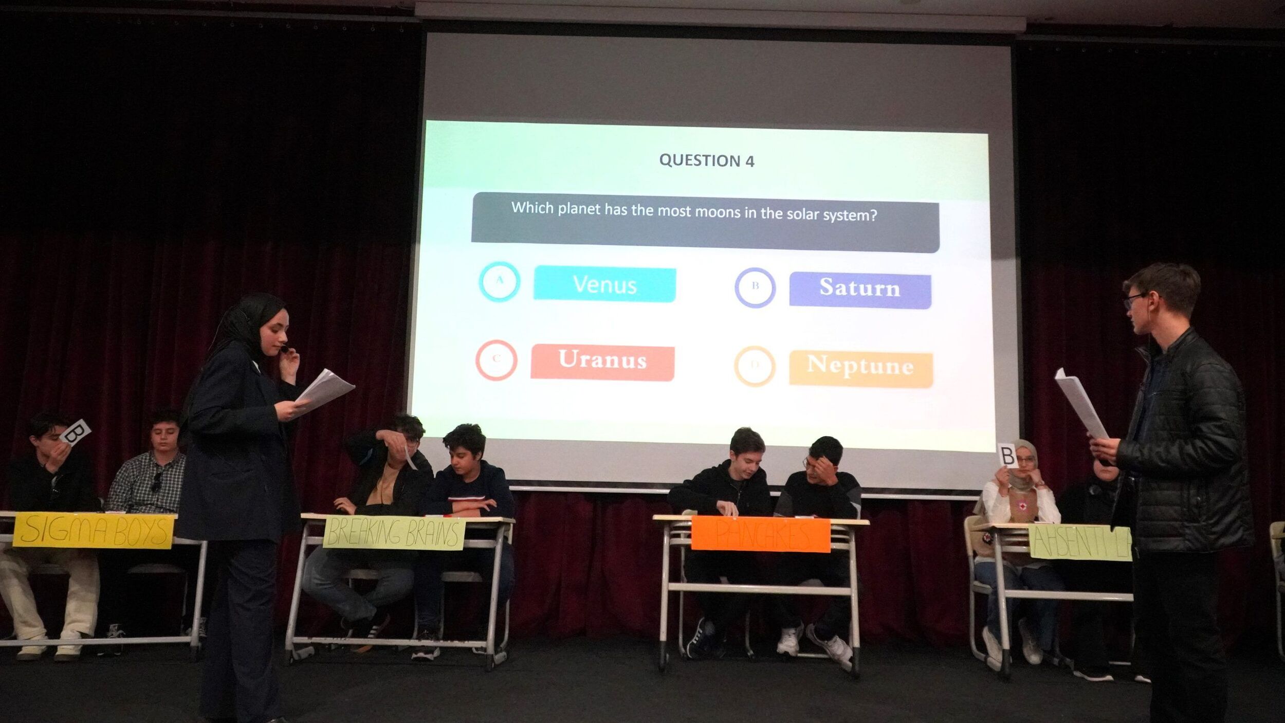 Farklı kategorilerden soruların yer aldığı yarışmada öğrenciler, hem İngilizce dil becerilerini hem de genel kültür bilgilerini sergileyerek kıyasıya bir mücadele ortaya koydular. Etkinlik, öğrencilerin bilgi dağarcığını geliştirmesine ve takım çalışması becerilerini pekiştirmesine olanak sağladı.