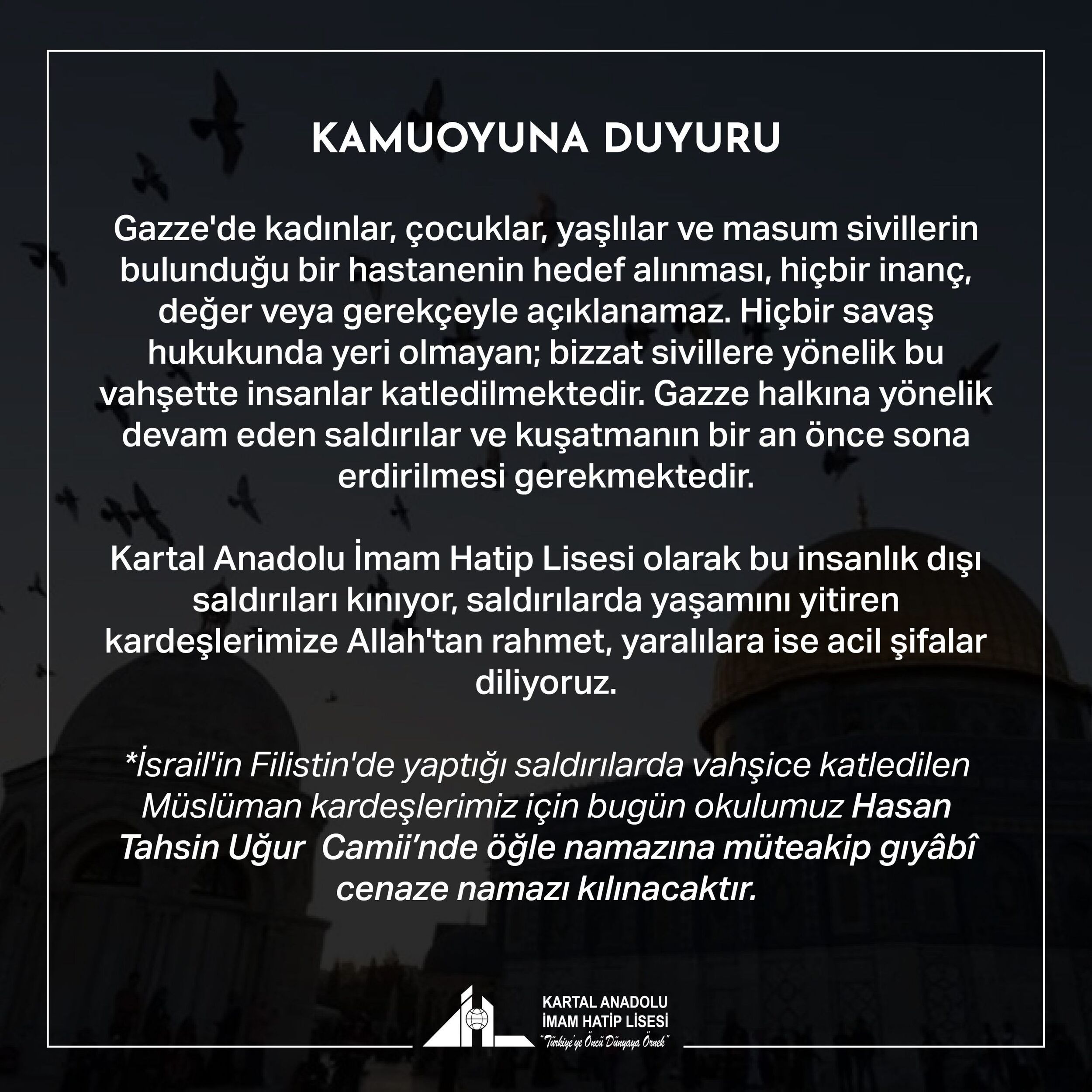 Kartal Anadolu İmam Hatip Lisesi olarak bu insanlık dışı saldırıları kınıyor, saldırılarda yaşamını yitiren kardeşlerimize Allah'tan rahmet, yaralılara ise acil şifalar diliyoruz.
