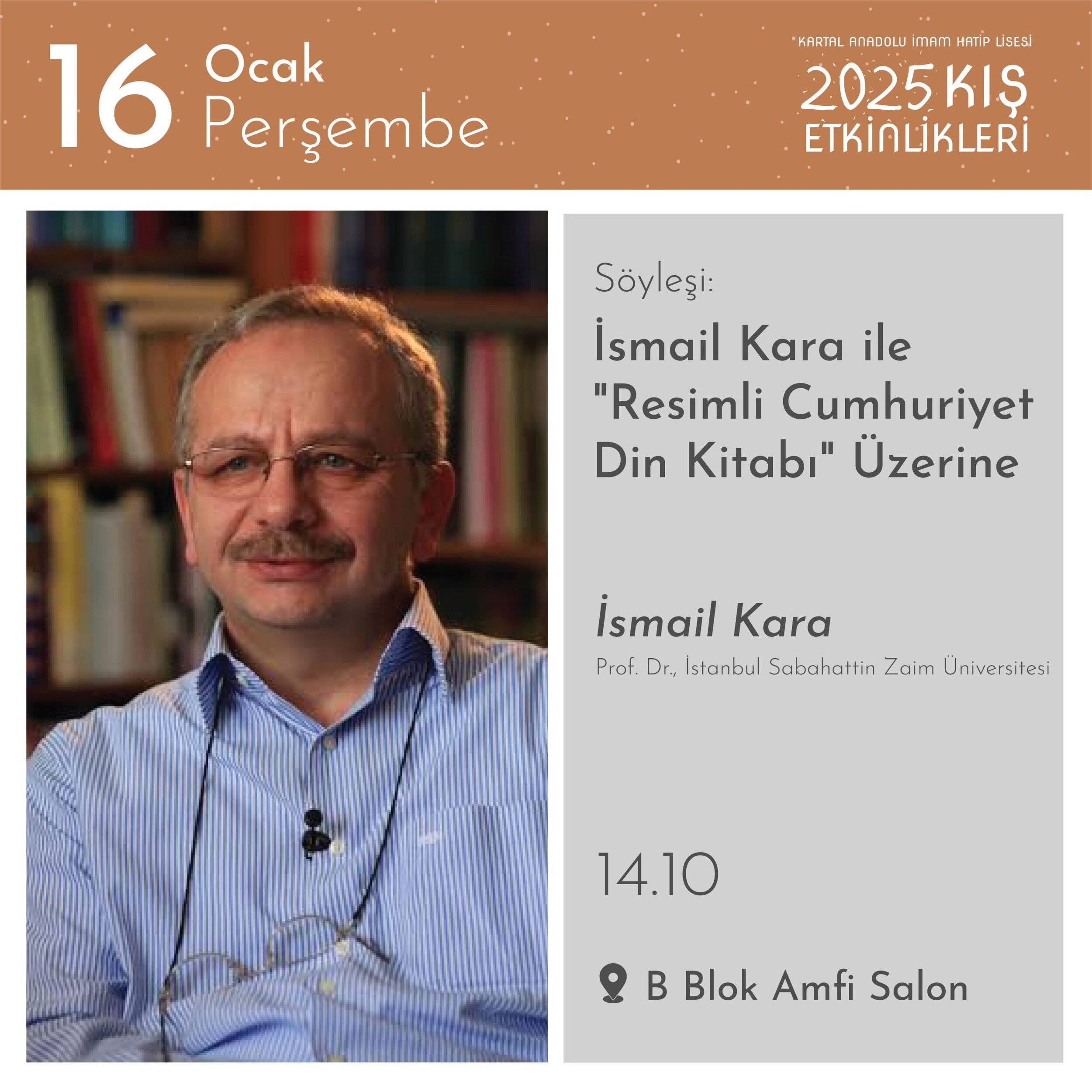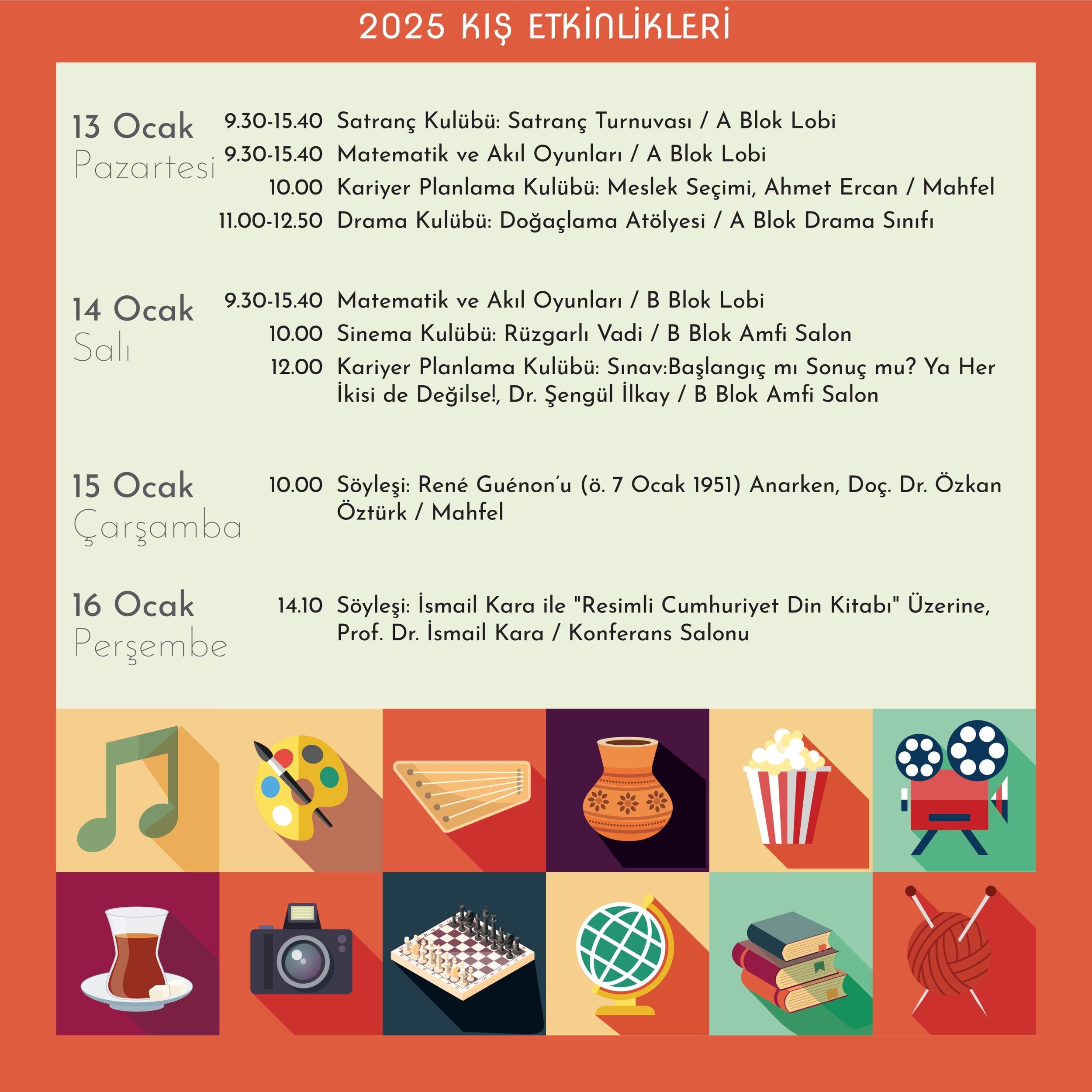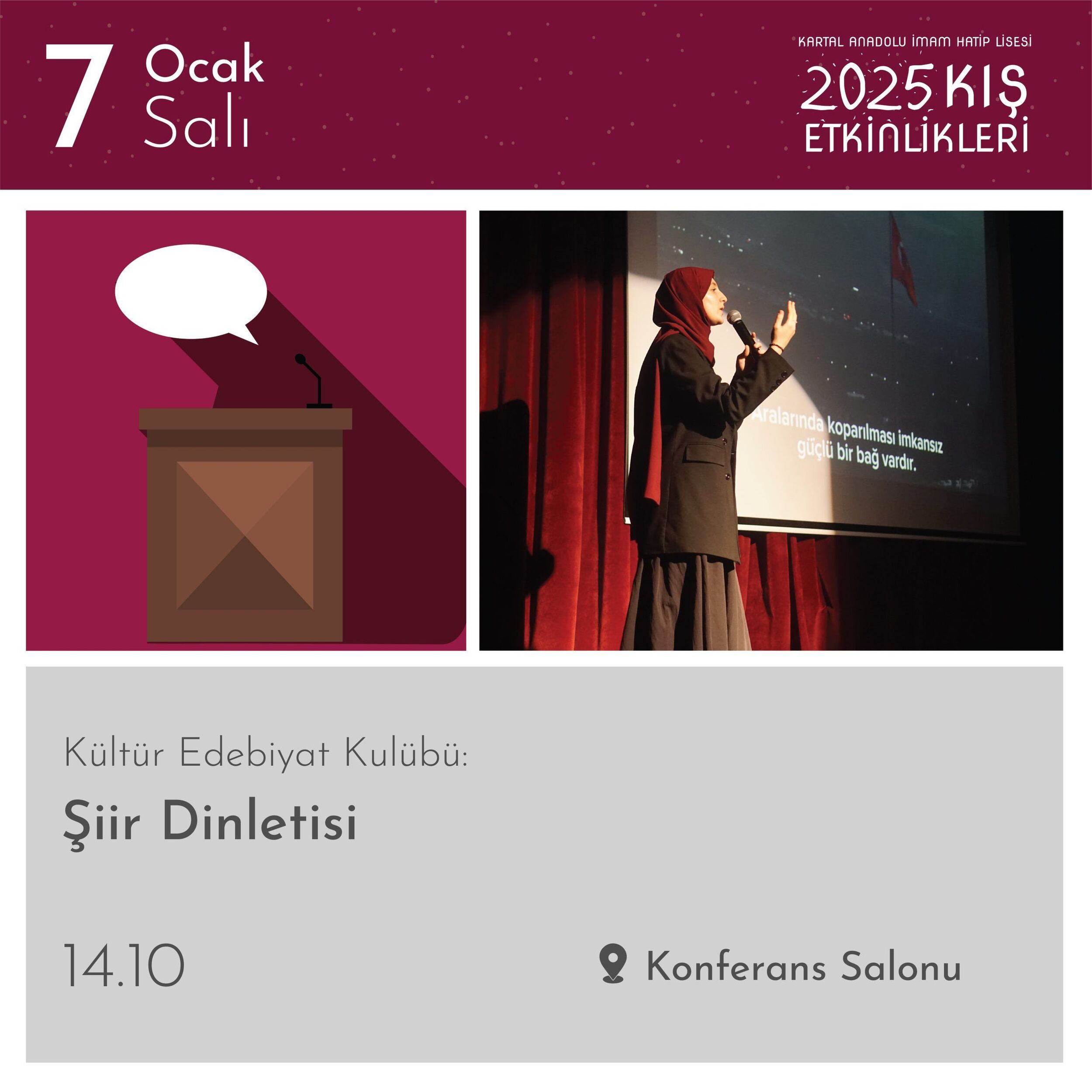 Kartal AİHL’de gelenekselleşen Kış Etkinlikleri”nde; birbirinden farklı isimlerin konuk olduğu söyleşiler, dinletiler, atölyeler, film gösterimleri, yarışmalar, kulüp etkinlikleri, ikramlar ve daha niceleri öğrencilerimizi bekliyor.