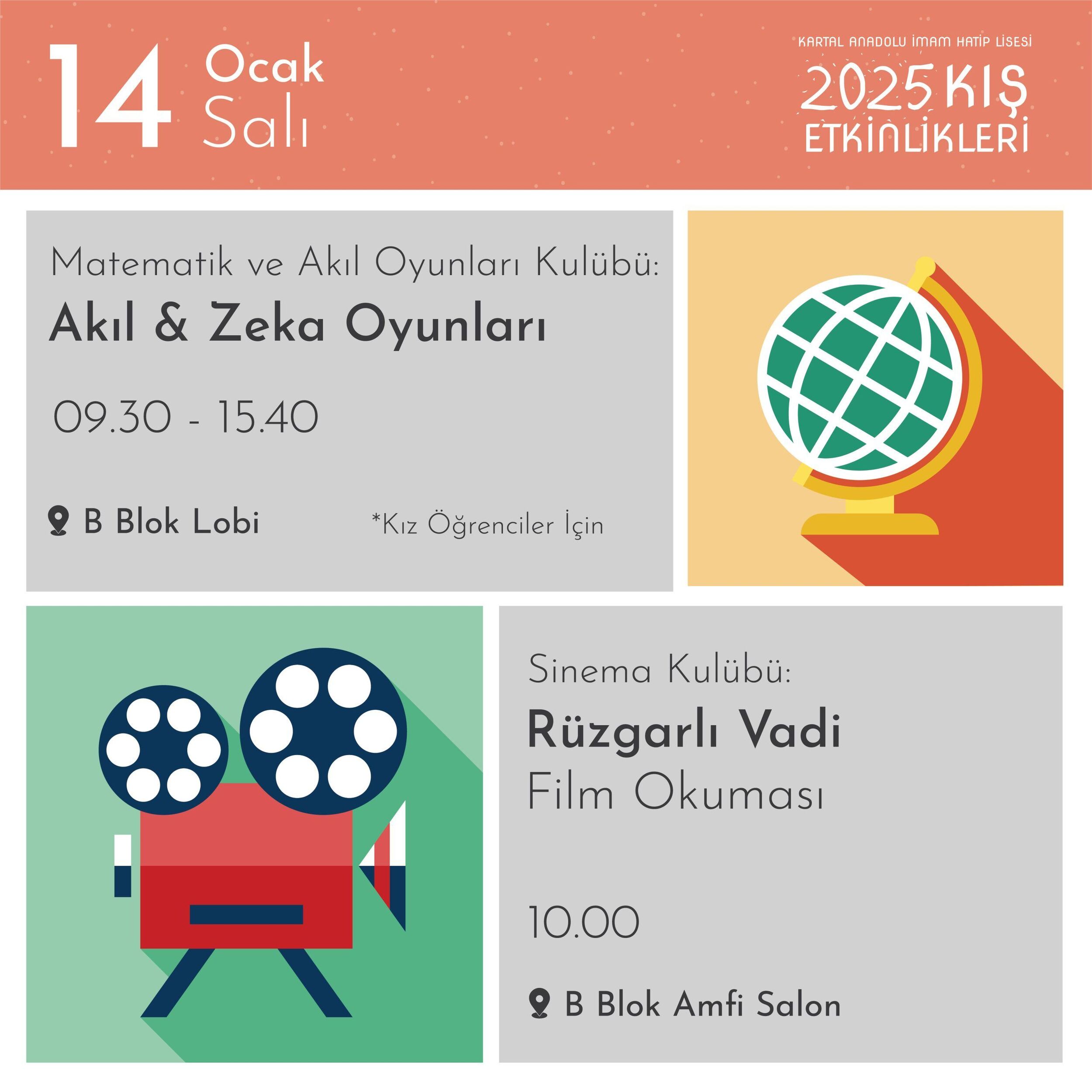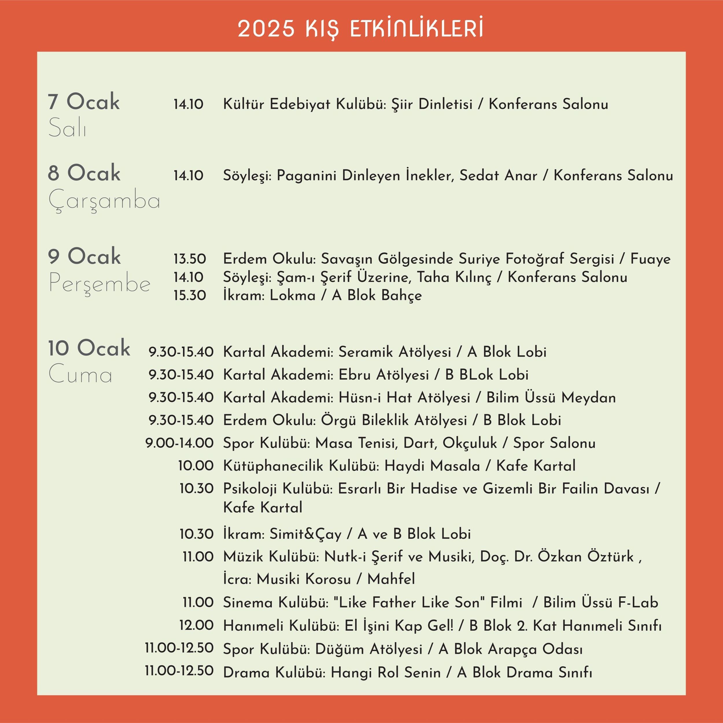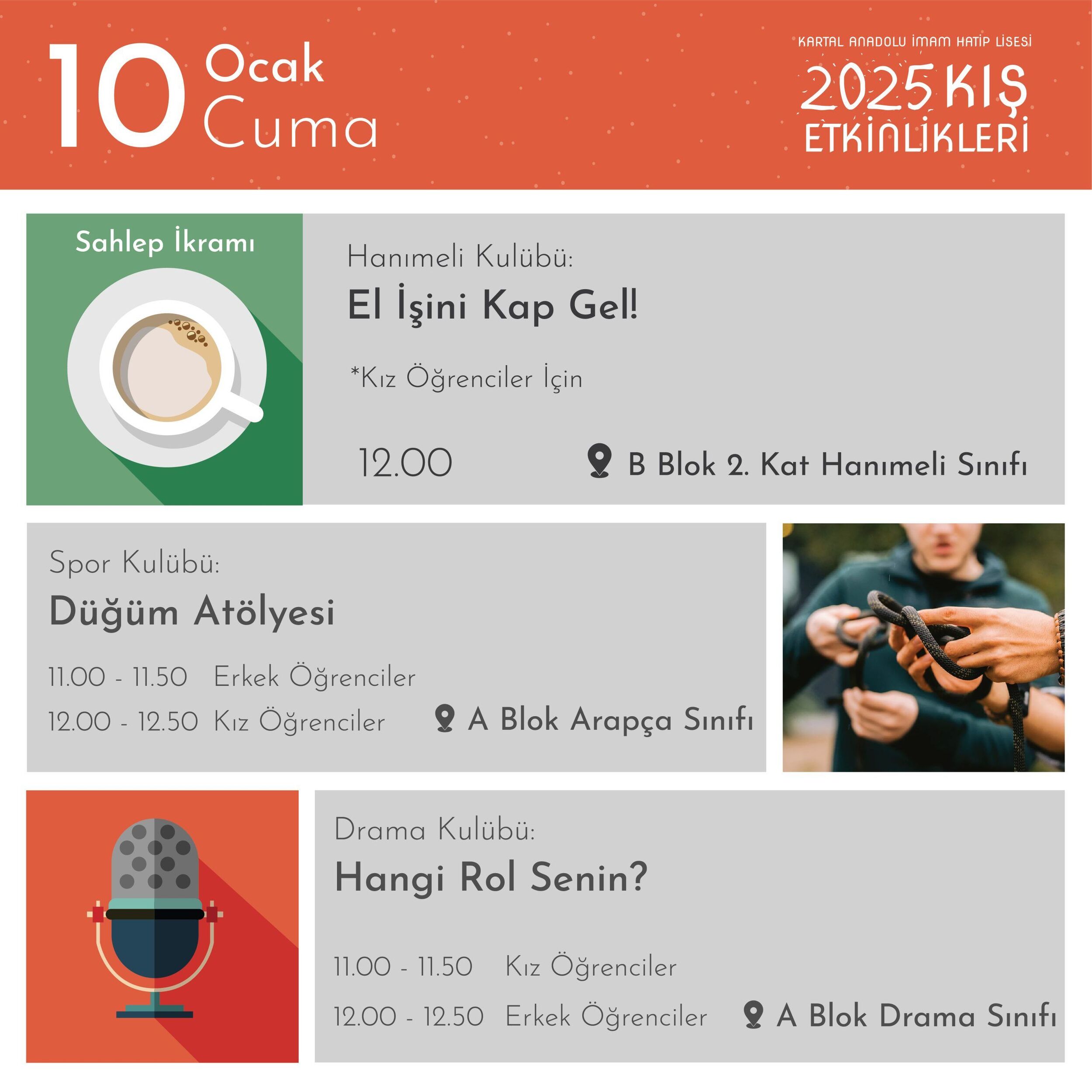 7-16 Ocak 2025 tarihleri arasında Kartal AİHL’nin kulüp çalışmaları ve atölyelerinin bir yansıması olan etkinlikler okulumuzun bütün mekânlarını şenlendirecek…