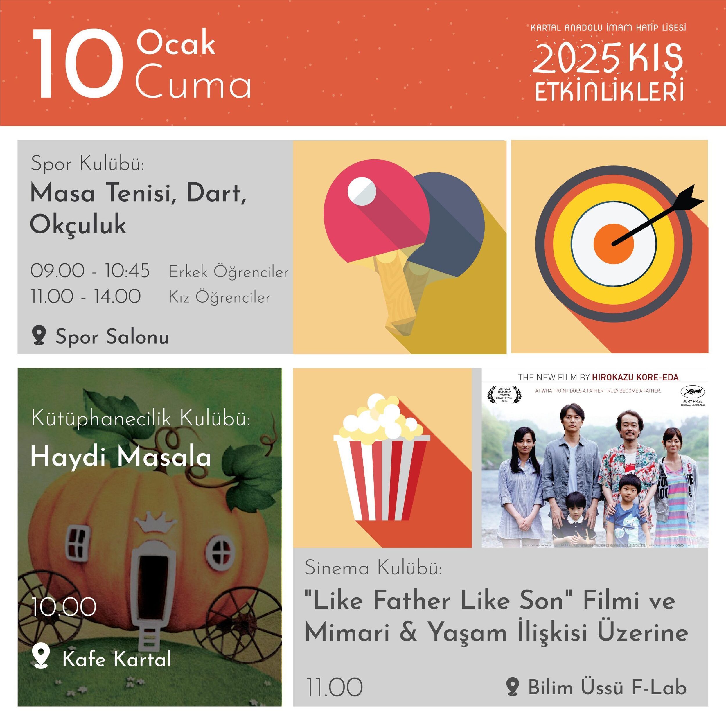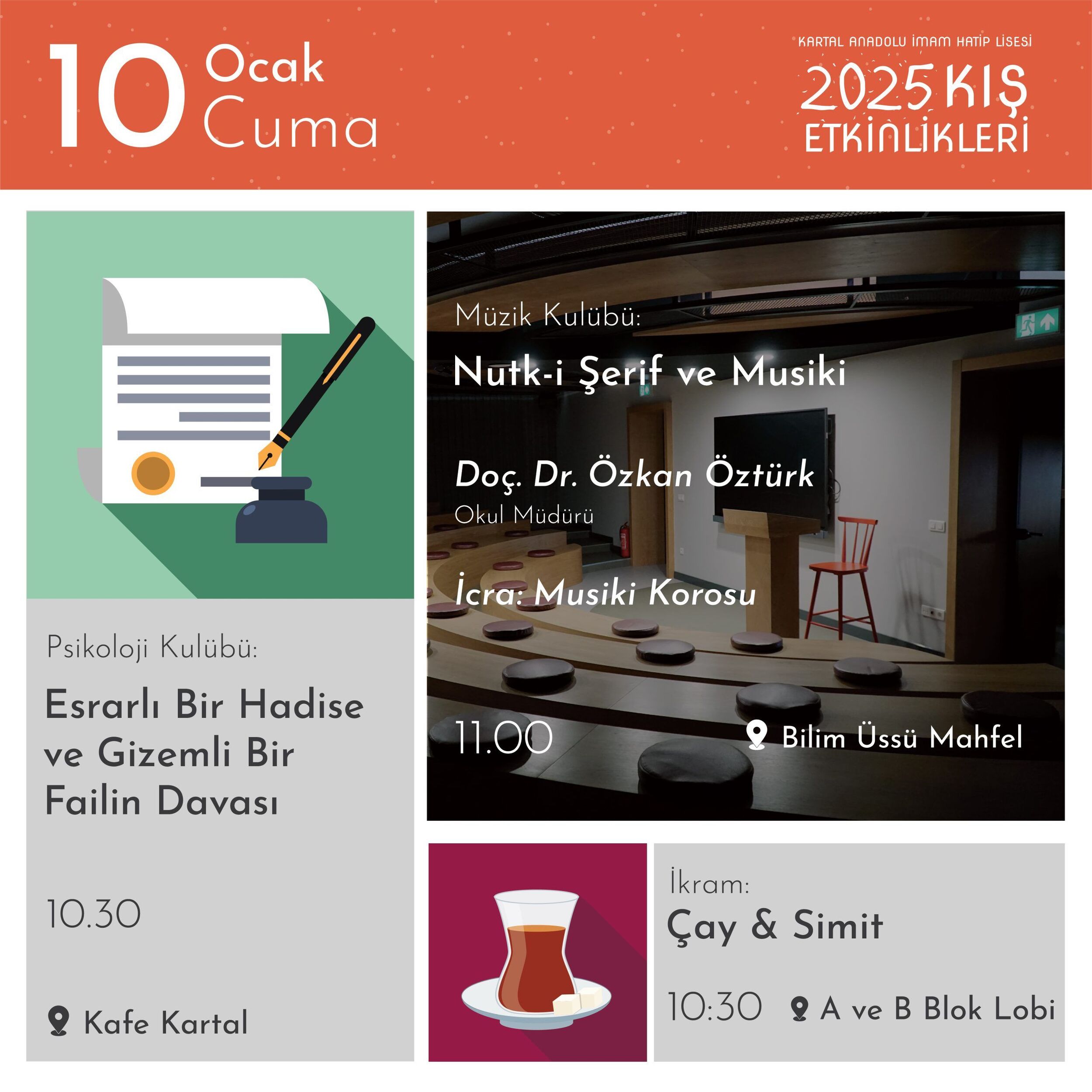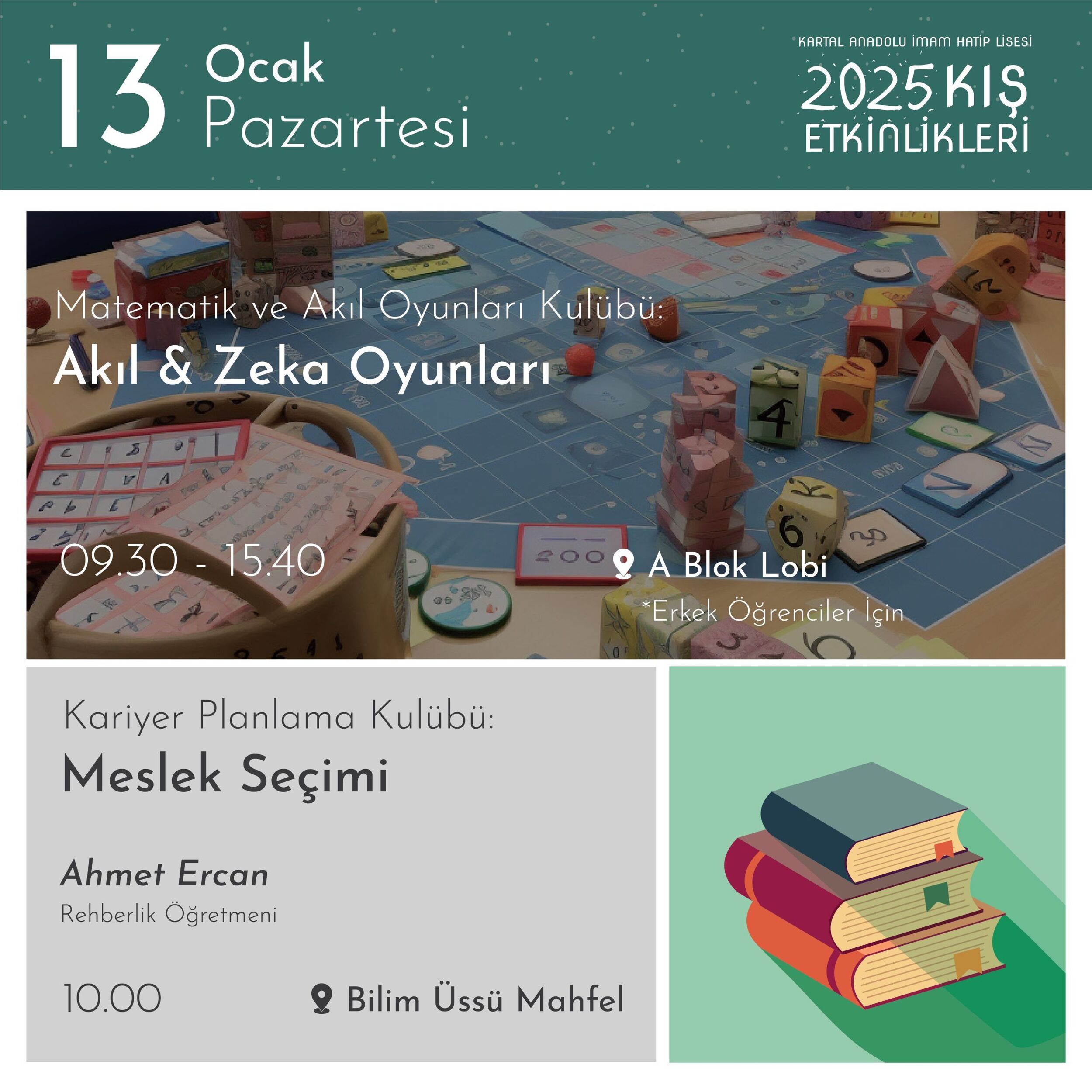7-16 Ocak 2025 tarihleri arasında Kartal AİHL’nin kulüp çalışmaları ve atölyelerinin bir yansıması olan etkinlikler okulumuzun bütün mekânlarını şenlendirecek…