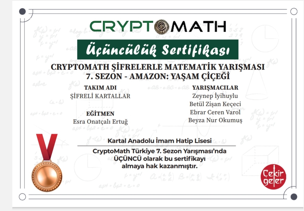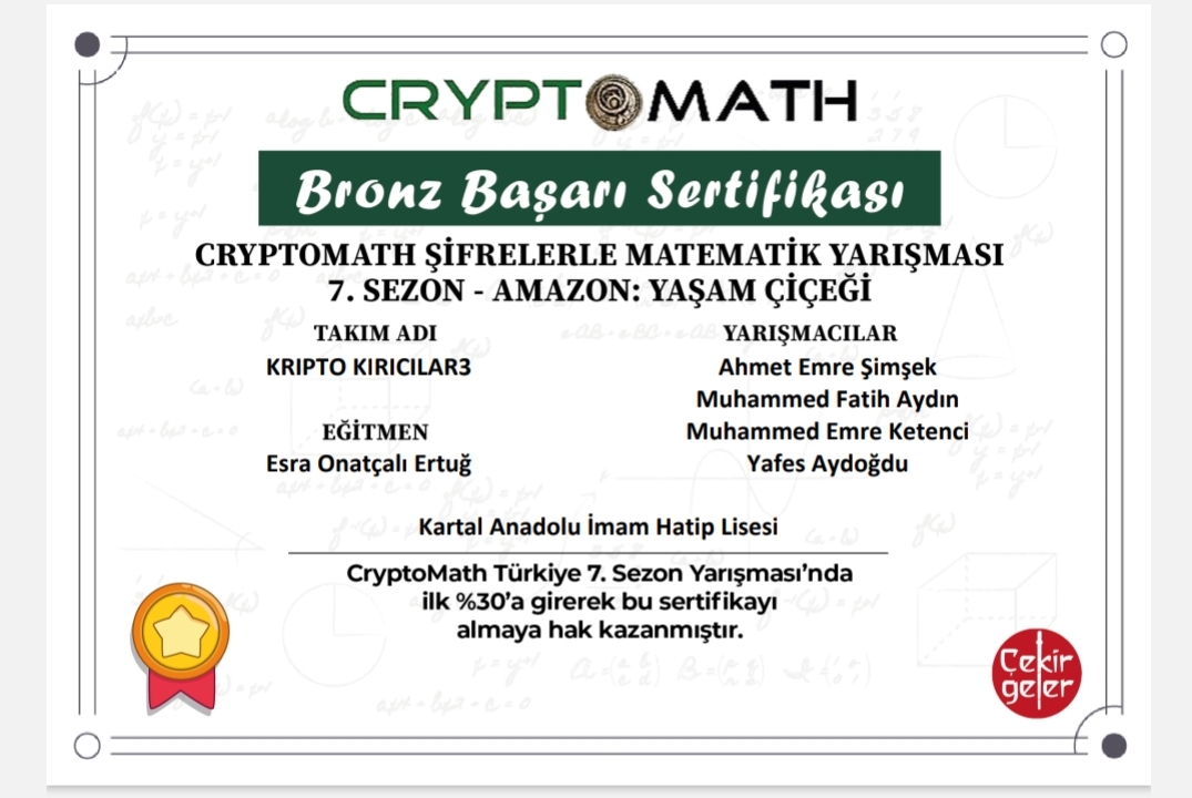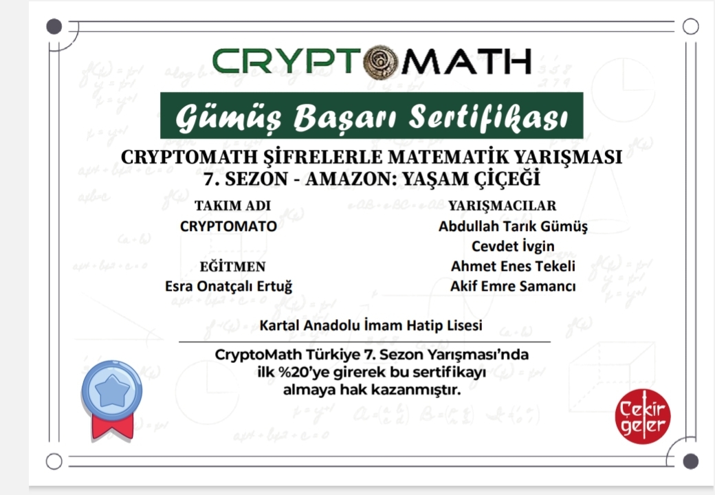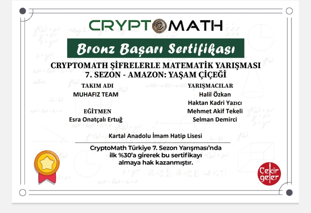 Kanguru Matematik işbirliği ile Çekirgeler Eğitim tarafından Türkiye çapında düzenlenen Matematiksel Şifreleme Yarışması 7. Sezon’a okulumuzdan 7 takımla katıldık. 9 haftalık süren maratonun sonunda tüm şifreleri doğru ve hızlı çözen takımlarımızdan;