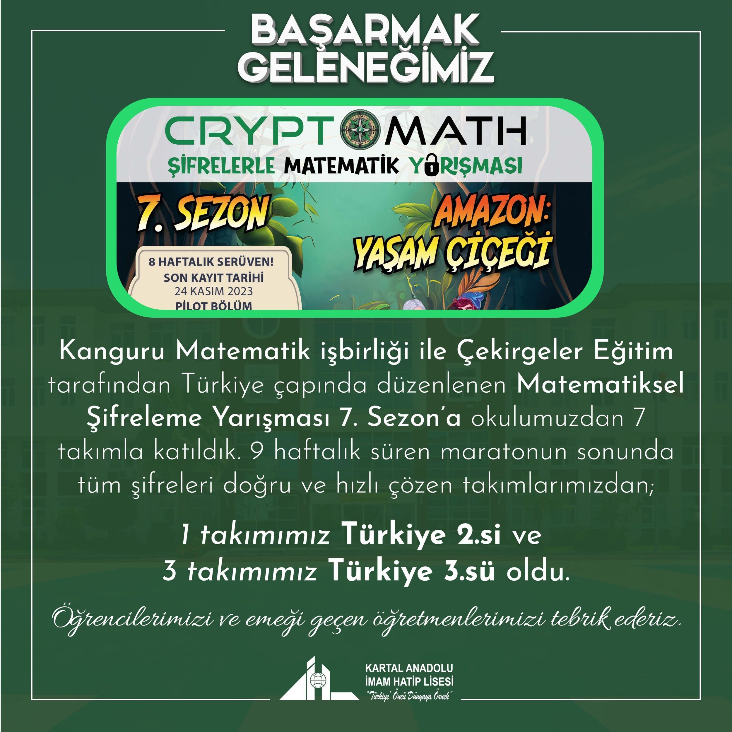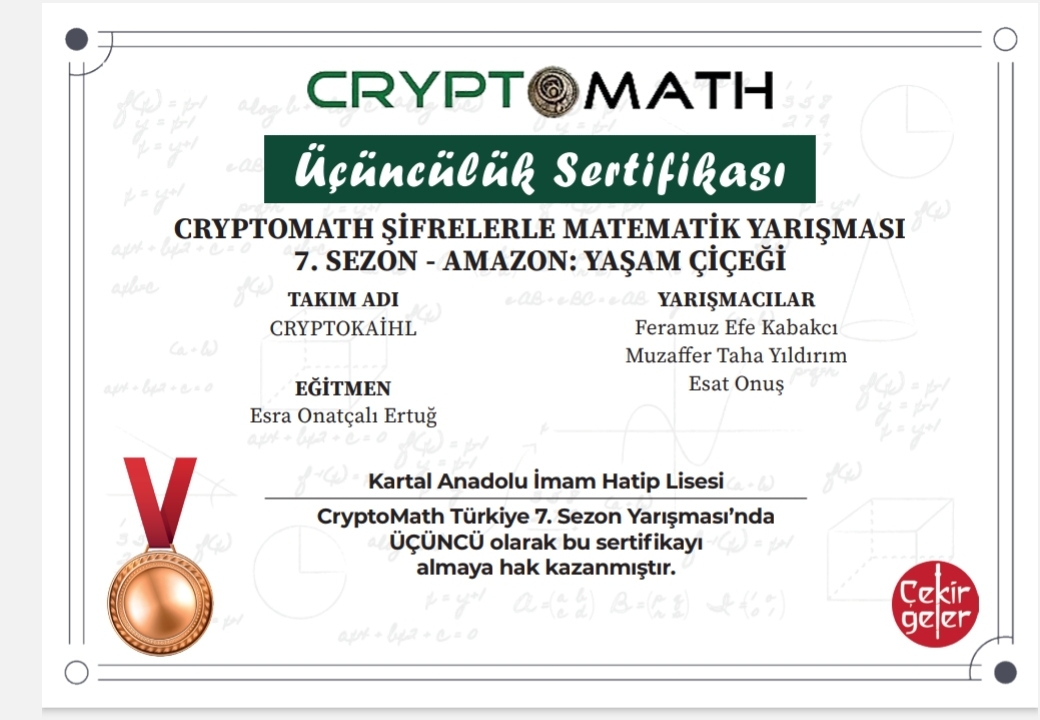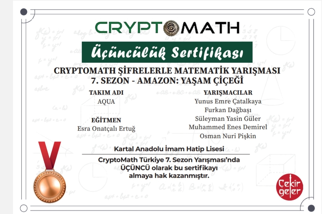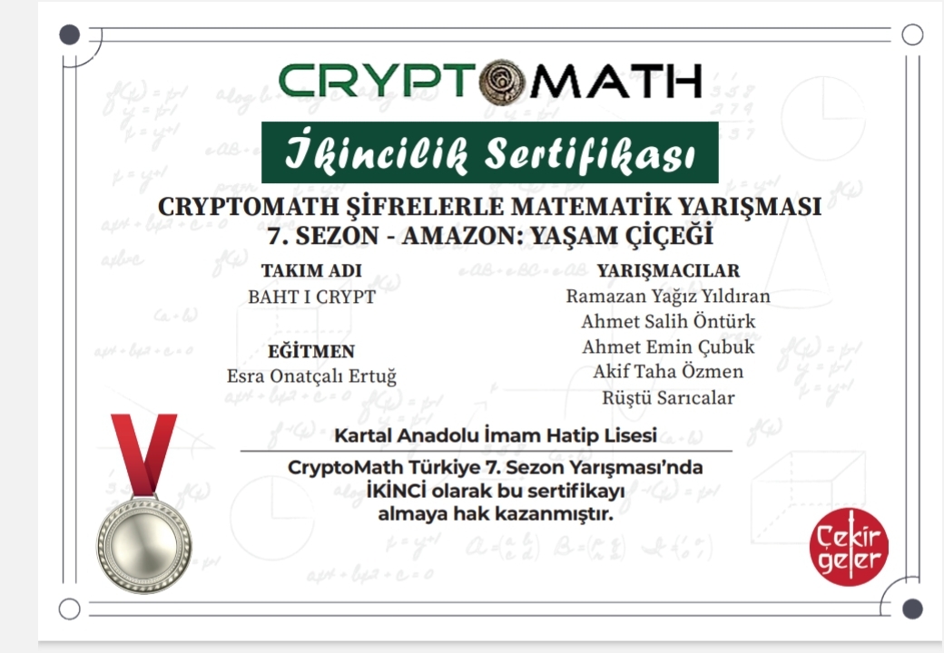 Kanguru Matematik işbirliği ile Çekirgeler Eğitim tarafından Türkiye çapında düzenlenen Matematiksel Şifreleme Yarışması 7. Sezon’a okulumuzdan 7 takımla katıldık. 9 haftalık süren maratonun sonunda tüm şifreleri doğru ve hızlı çözen takımlarımızdan;