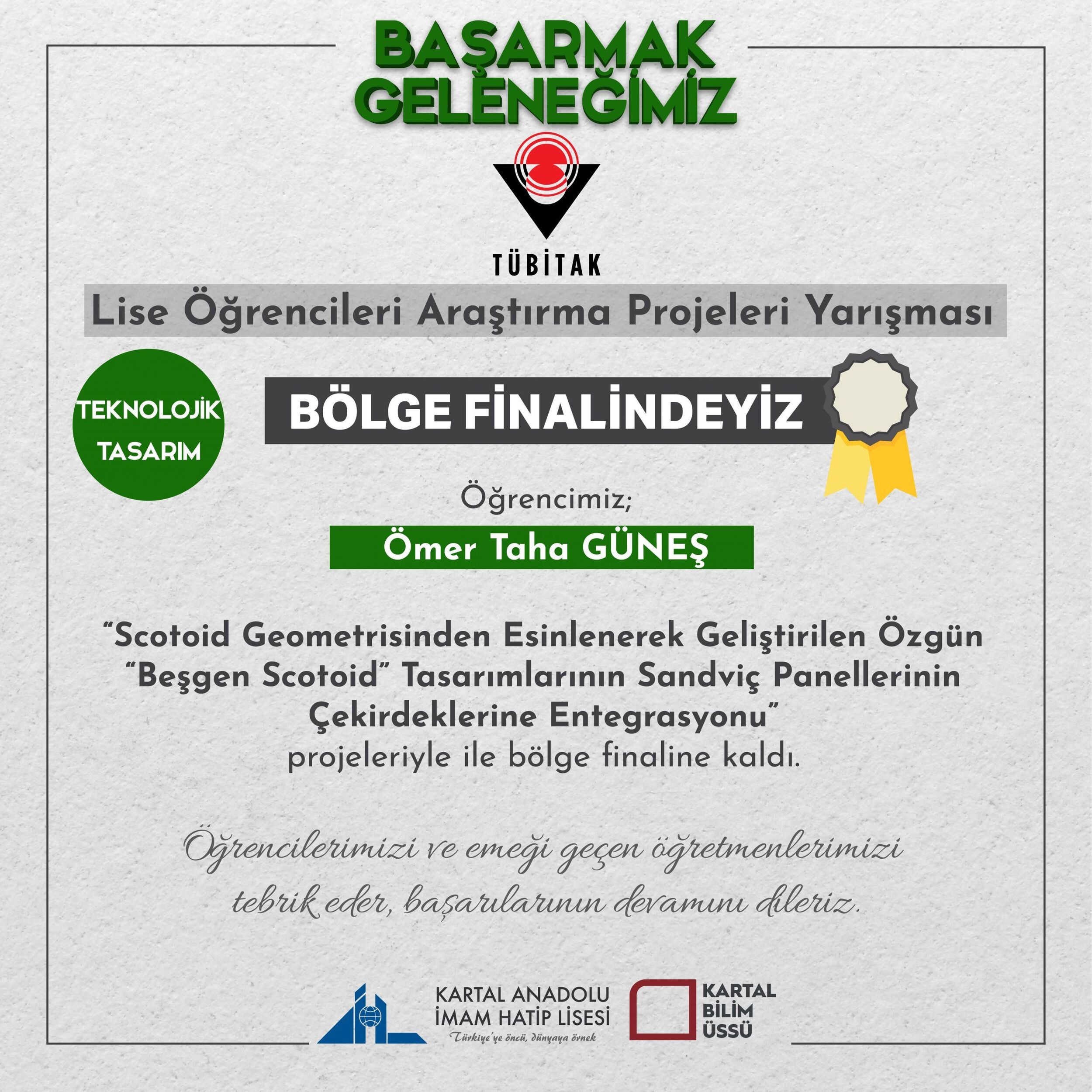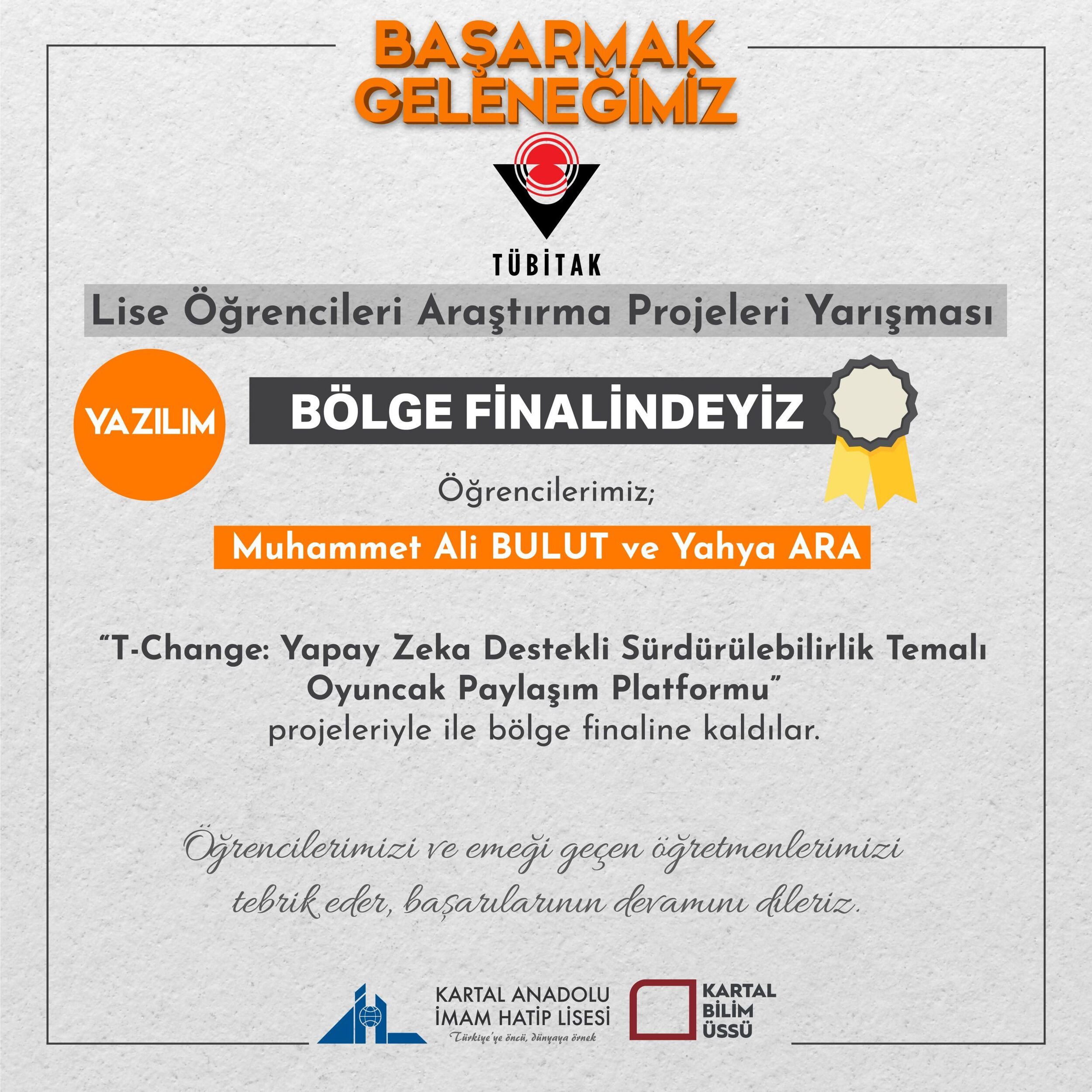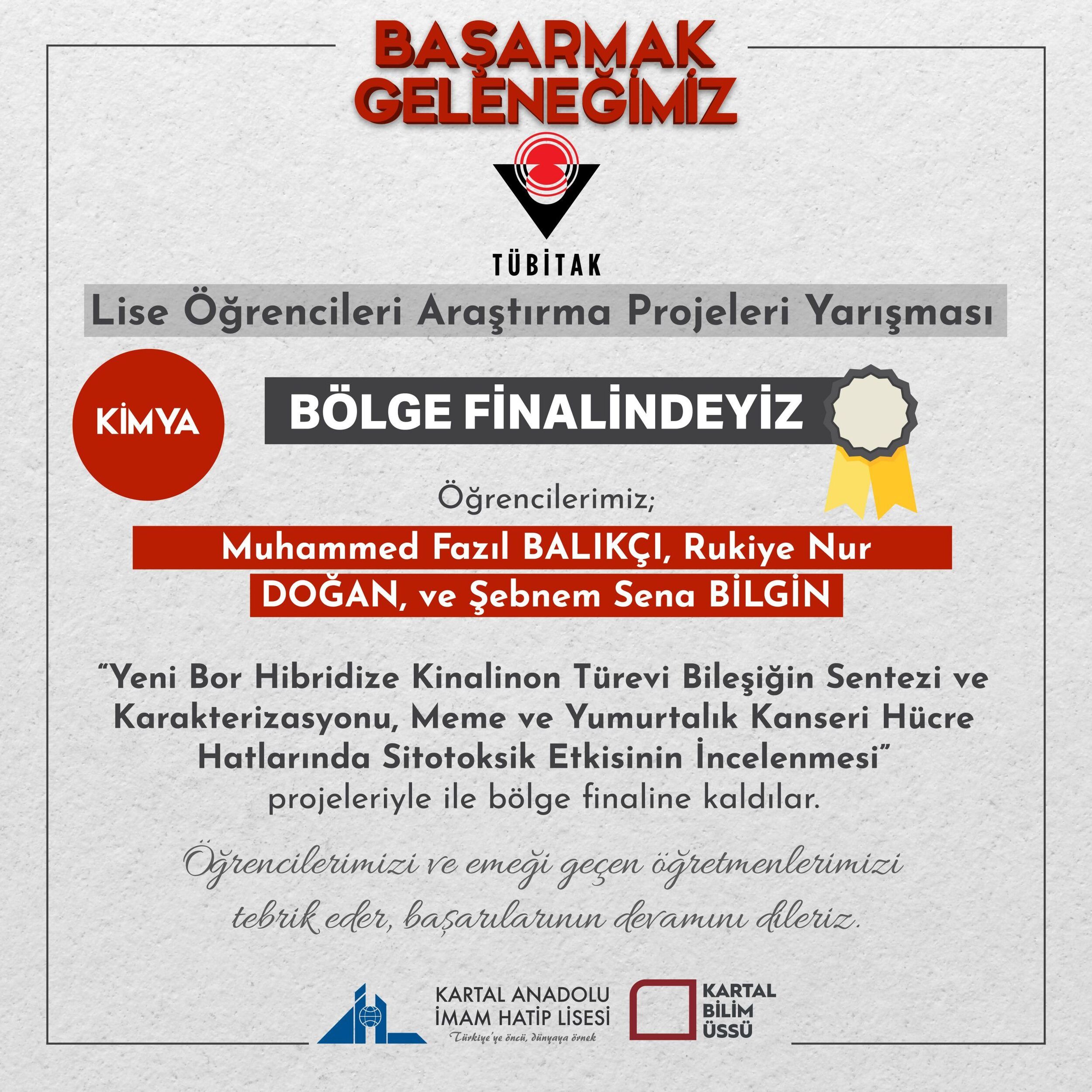TÜBİTAK 2204 A Lise Öğrencileri Araştırma Projeleri Yarışması'nda öğrencilerimiz Kimya, Teknolojik Tasarım ve Yazılım kategorisinde yarışan üç projeyle finale kaldılar. Öğrencilerimizi ve emeği geçen öğretmenlerimizi tebrik eder, başarılarının devamını dileriz.