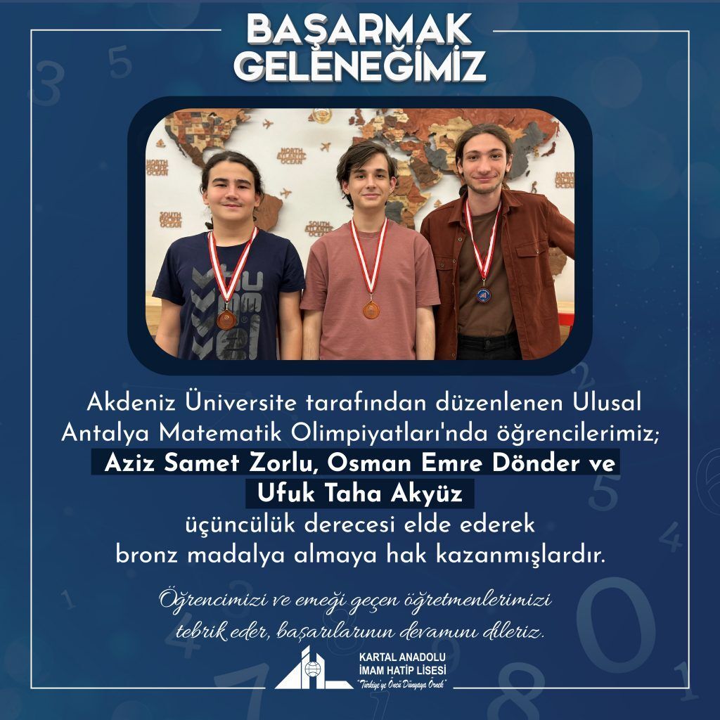 Akdeniz Üniversite tarafından düzenlenen Ulusal Antalya Matematik Olimpiyatları'nda öğrencilerimiz;